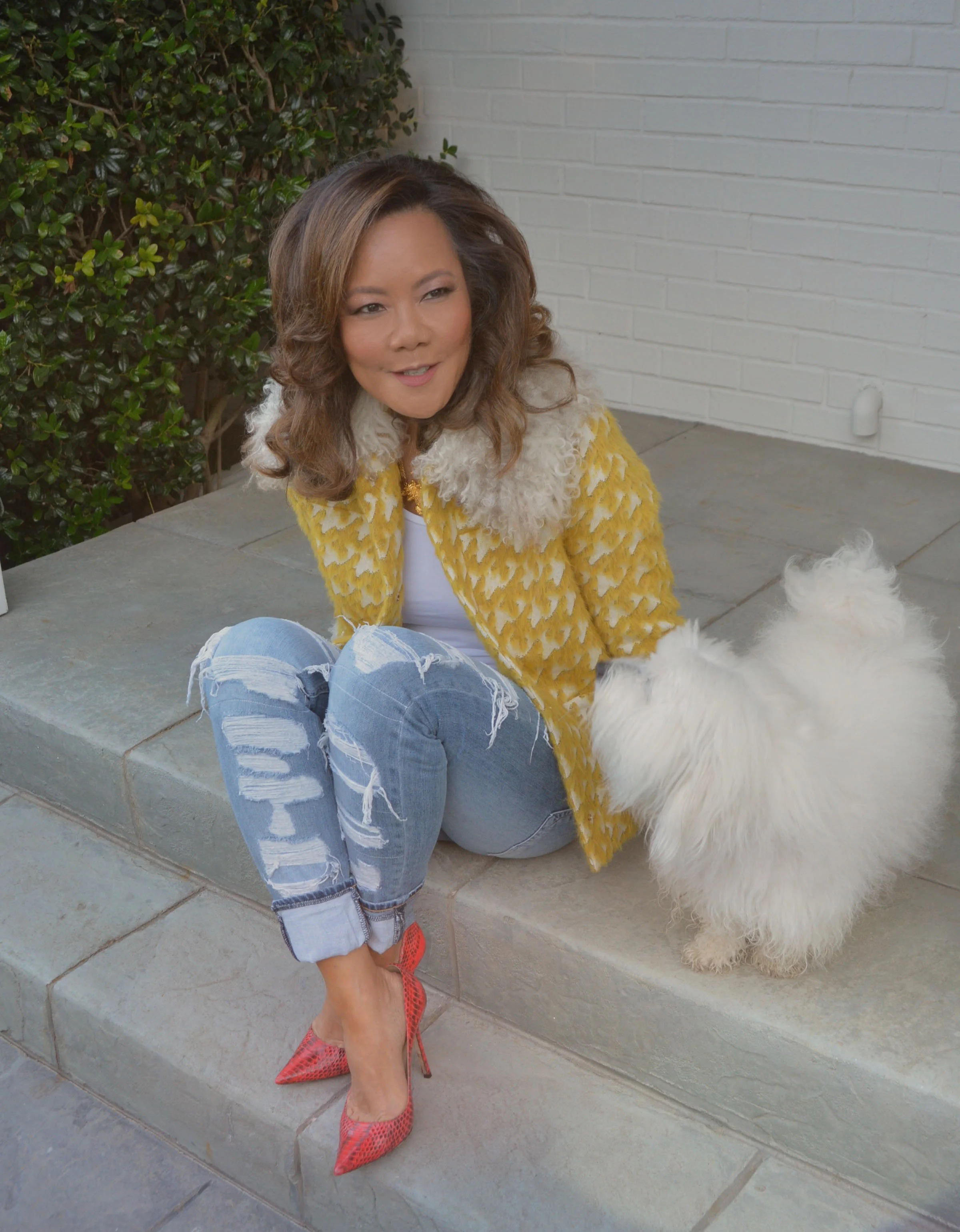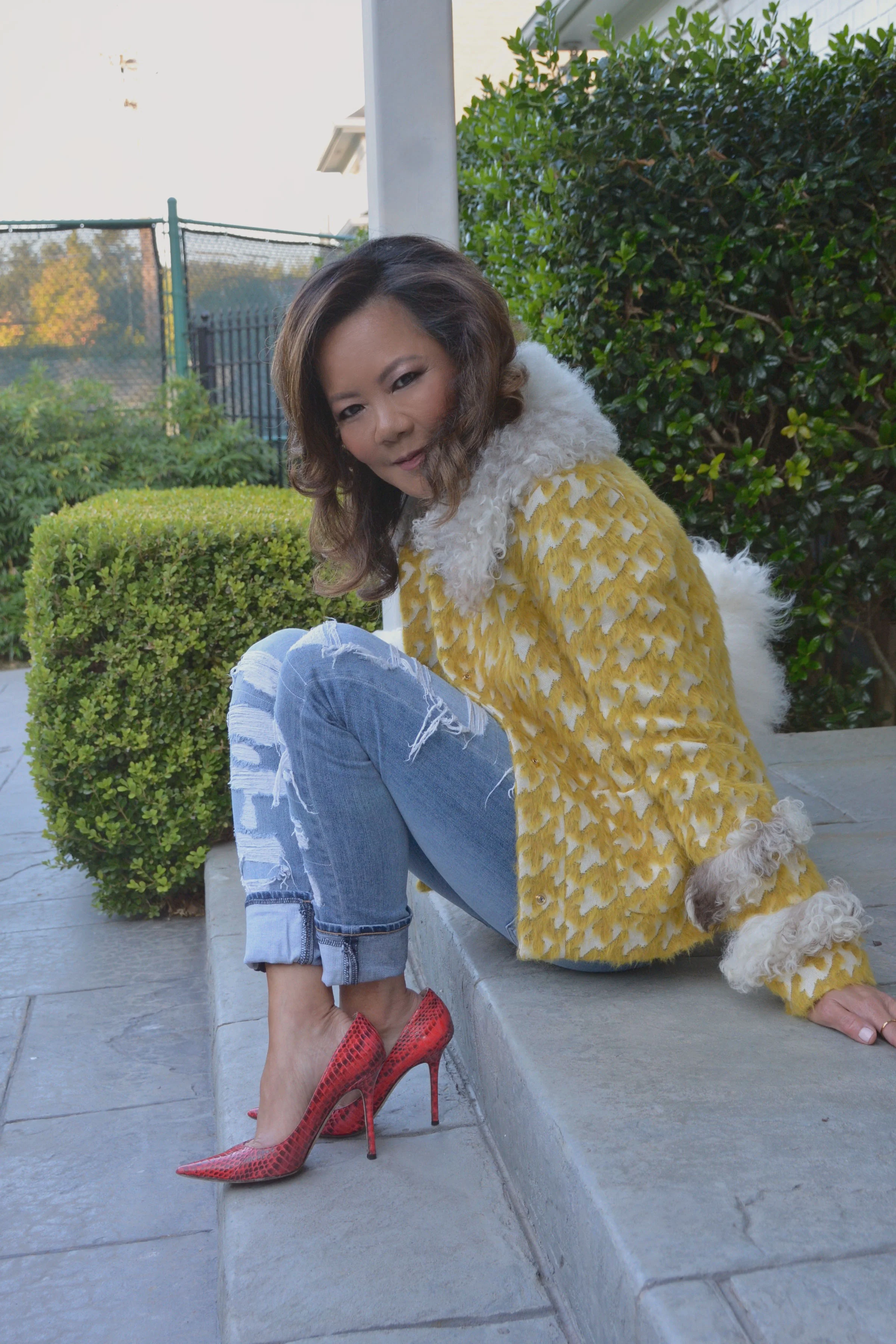 From the moment I purchased this Roberto Cavalli gold jacket I knew I wanted to enjoy the versatility of the detachable fur collar and pair it with fun pieces that would play off the texture and colors. Red snakeskin Jimmy Choo pumps seemed to be the obvious choice to juxtapose perfectly with my favorite Rag and Bone distressed jeans.