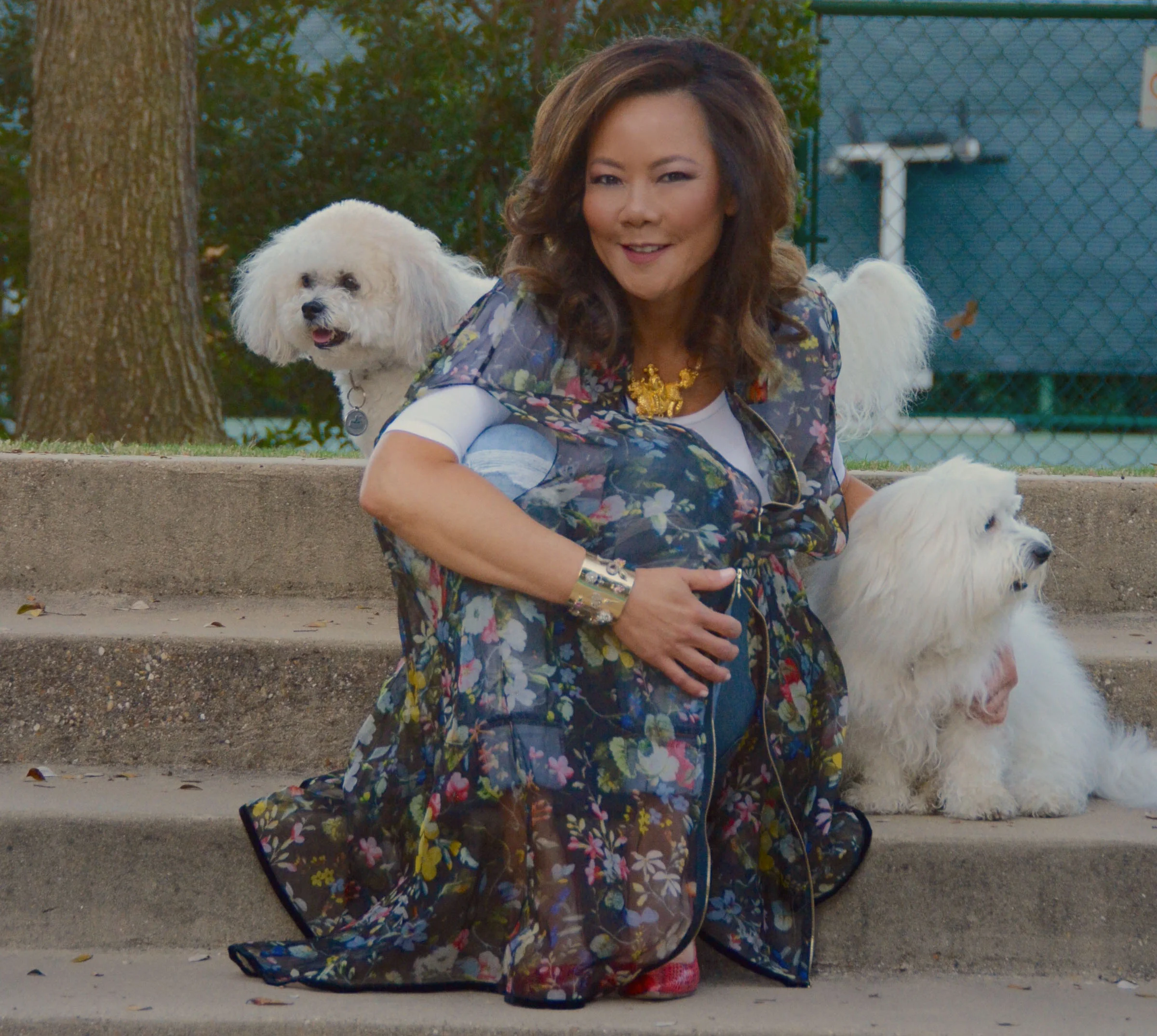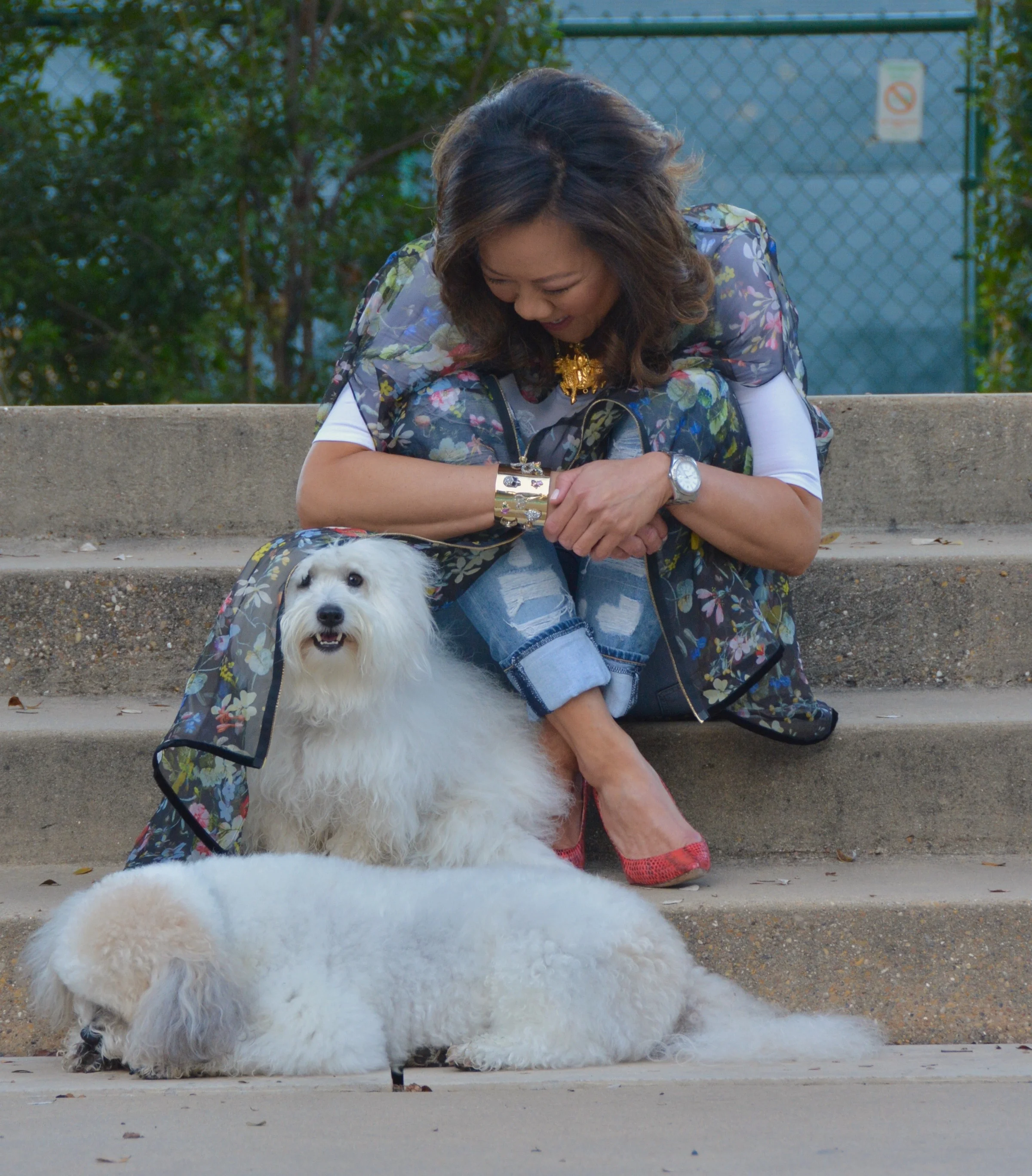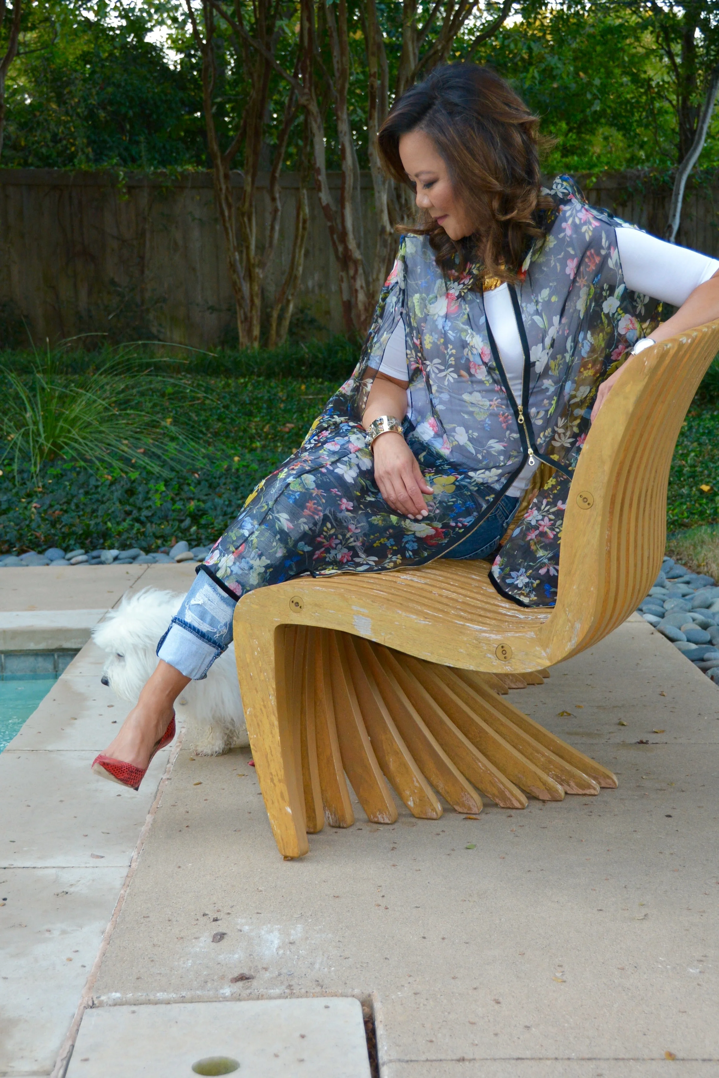 This weekend proved to be one of those delightful transitional weather days where I was able to greet guests in this fabulous Erdam floral cape. I paired it with a Majestic tee shirt, my Rag and Bone distressed patchwork jeans and Jimmy Choo red snakeskin pumps, which have been incredibly versatile with so many outfits this season. I've been using them as a neutral piece to anchor outfits. I also love the Alexis Bittar gold cuff which goes with almost everything in my closet.