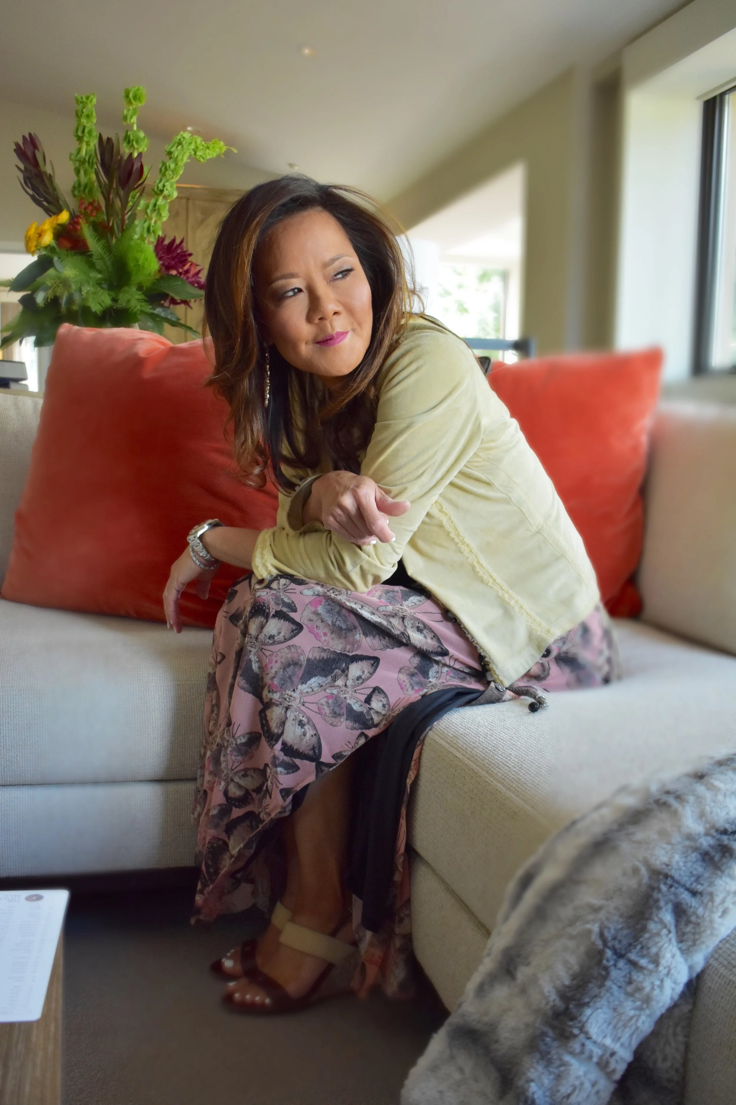 The A-line silhouette of this sleeveless, pink butterfly print maxi dress by Fuzzi is perfect for layering on days like this. I love how it hits just at the ankle but there's a side slit that accentuates the leg and looks just as pretty with sandals in warm weather as it does with tall boots in cool weather. I've added a jewel belt by Anne Fontaine which I'm wearing just at the hip.