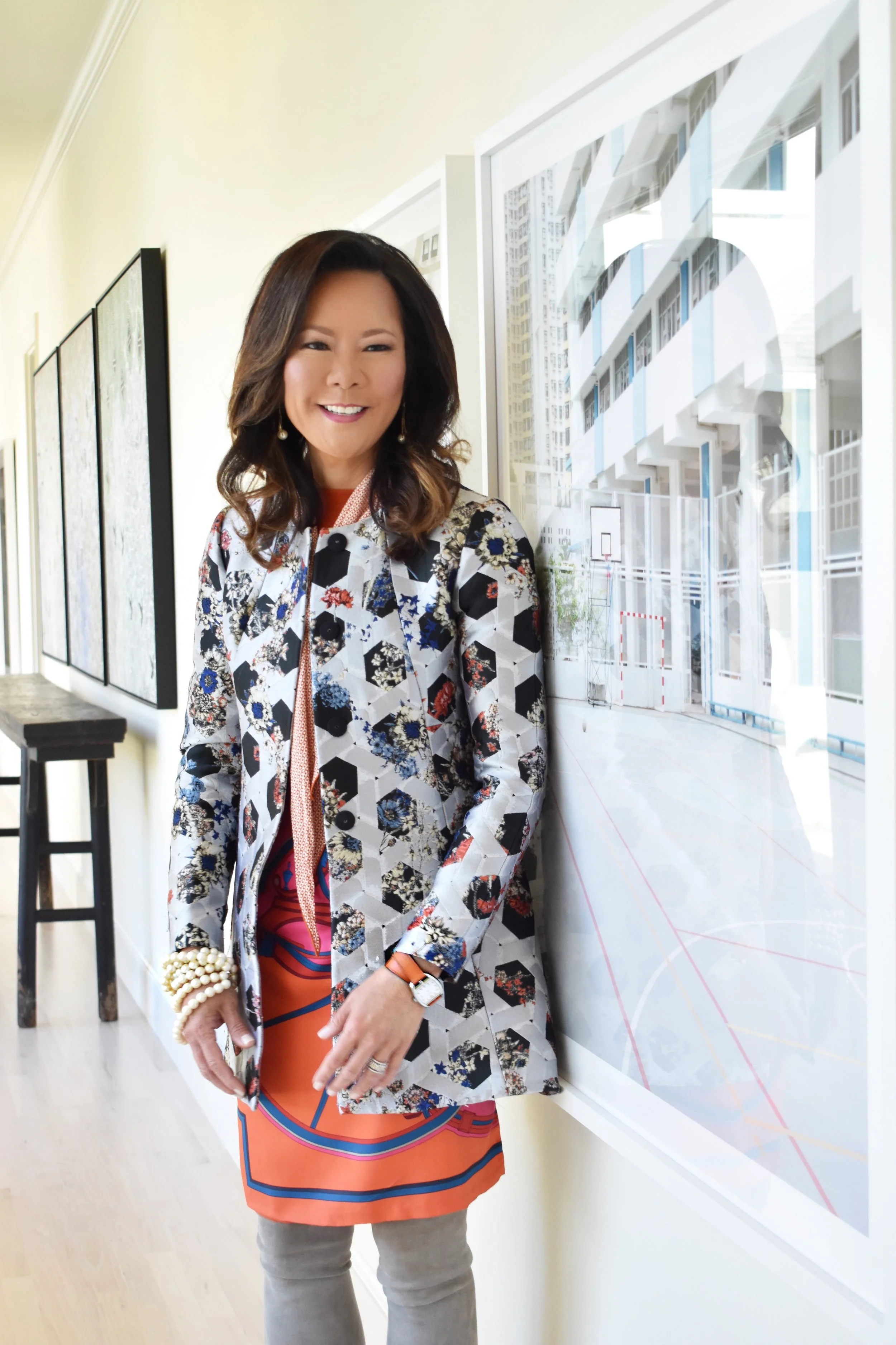 To give the outfit a little sparkle, I added some fun costume pearl bracelets and earrings from Neiman Marcus and my orange Hermes Watch... and of course, my Tiffany diamond wedding band.