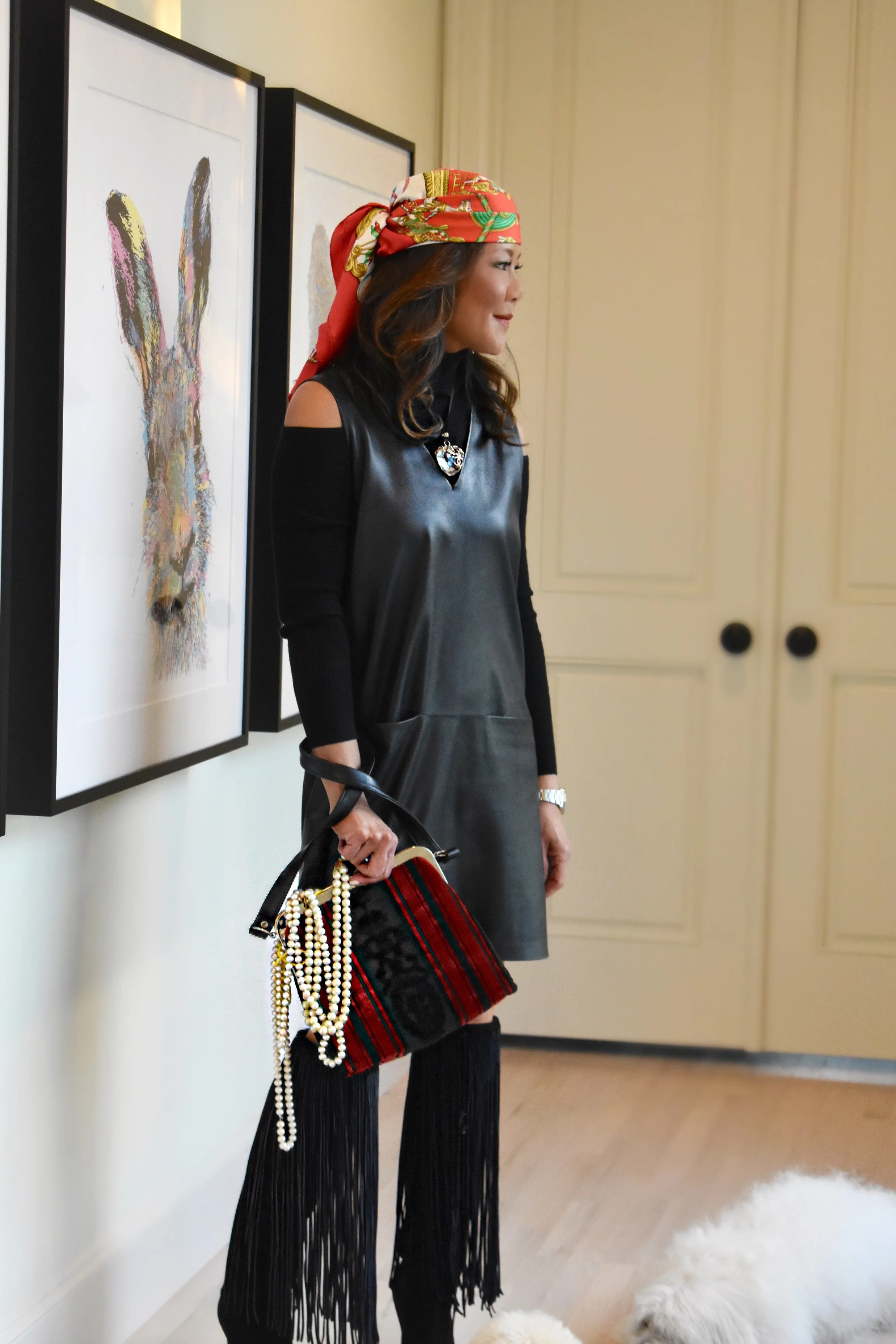 I love discovering (and collecting) little vintage treasures in my travels, and take even more delight when I can wear them! The black leather shift dress by Vince seemed like a great backdrop to feature some of my absolute favorites. Around my neck is a Silver-tone Chanel crystal heart pendant featuring CC logo, crystal and faux pearl accents, black grosgrain cord and lobster clasp closure from the Fall 2004 Collection. I adore that it's both chunky yet elegant and it sparkles no matter what I wear it with. On my head, I've tied and wrapped a vintage "Luna Park" silk scarf by Joachim Metz for Hermes in 1993. The gorgeous shades or reds greens, and golds give a fantastic lift of color to all the dark tones in my dress and cold shoulder sweater. I am carrying a red and black velvet stripe bag with multiple strands of cascading faux pearls and a black leather strap - one of the many "flea market finds" that I just couldn't say "no" to.