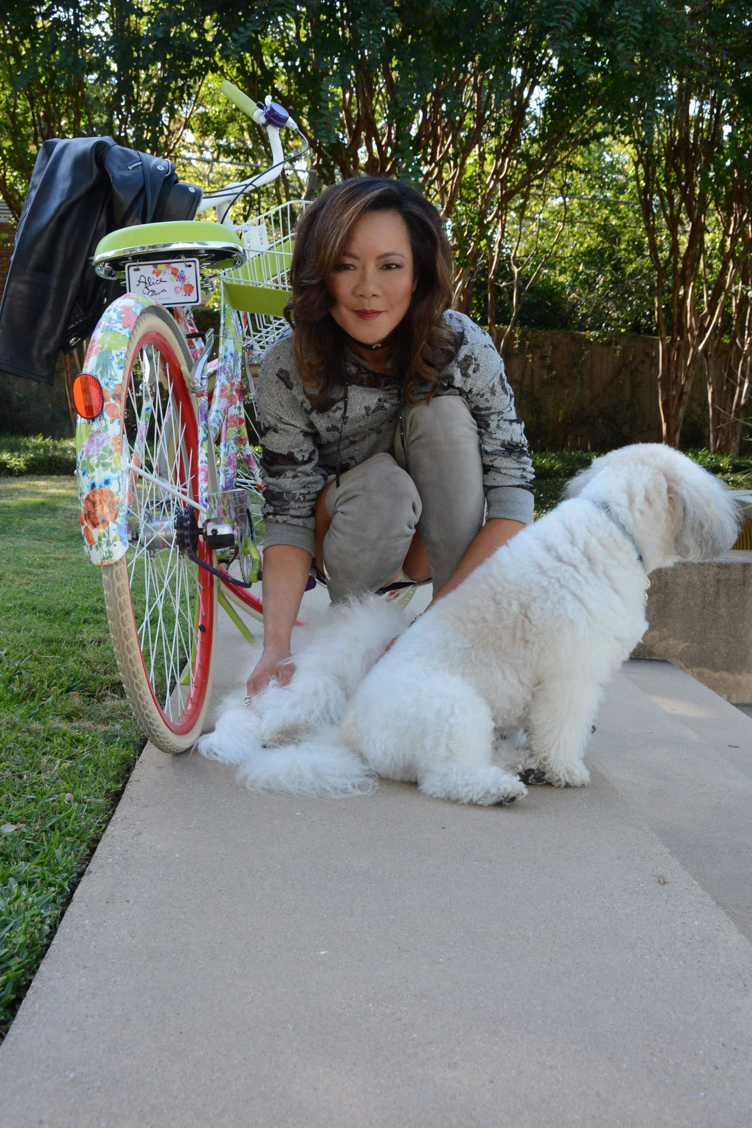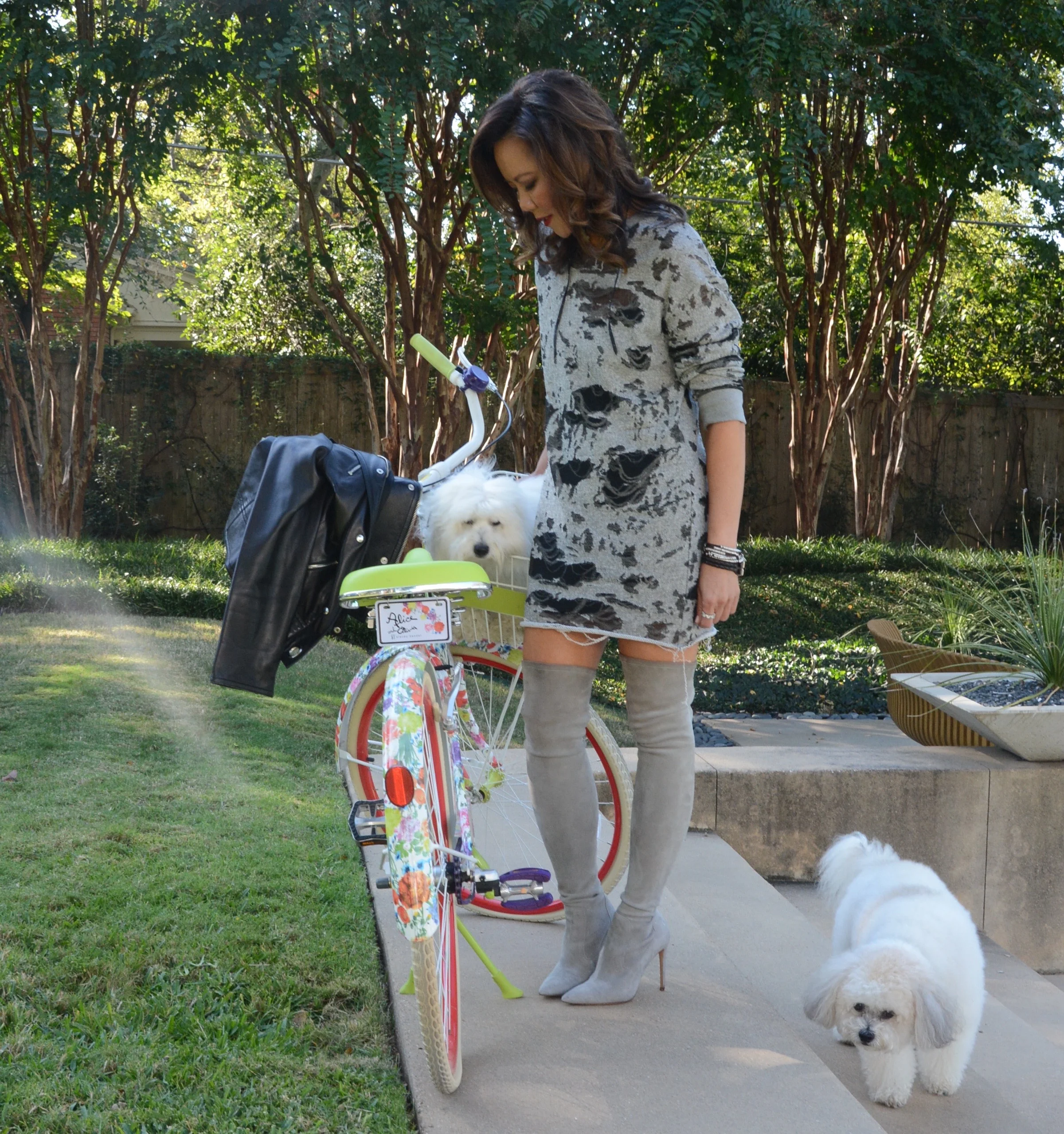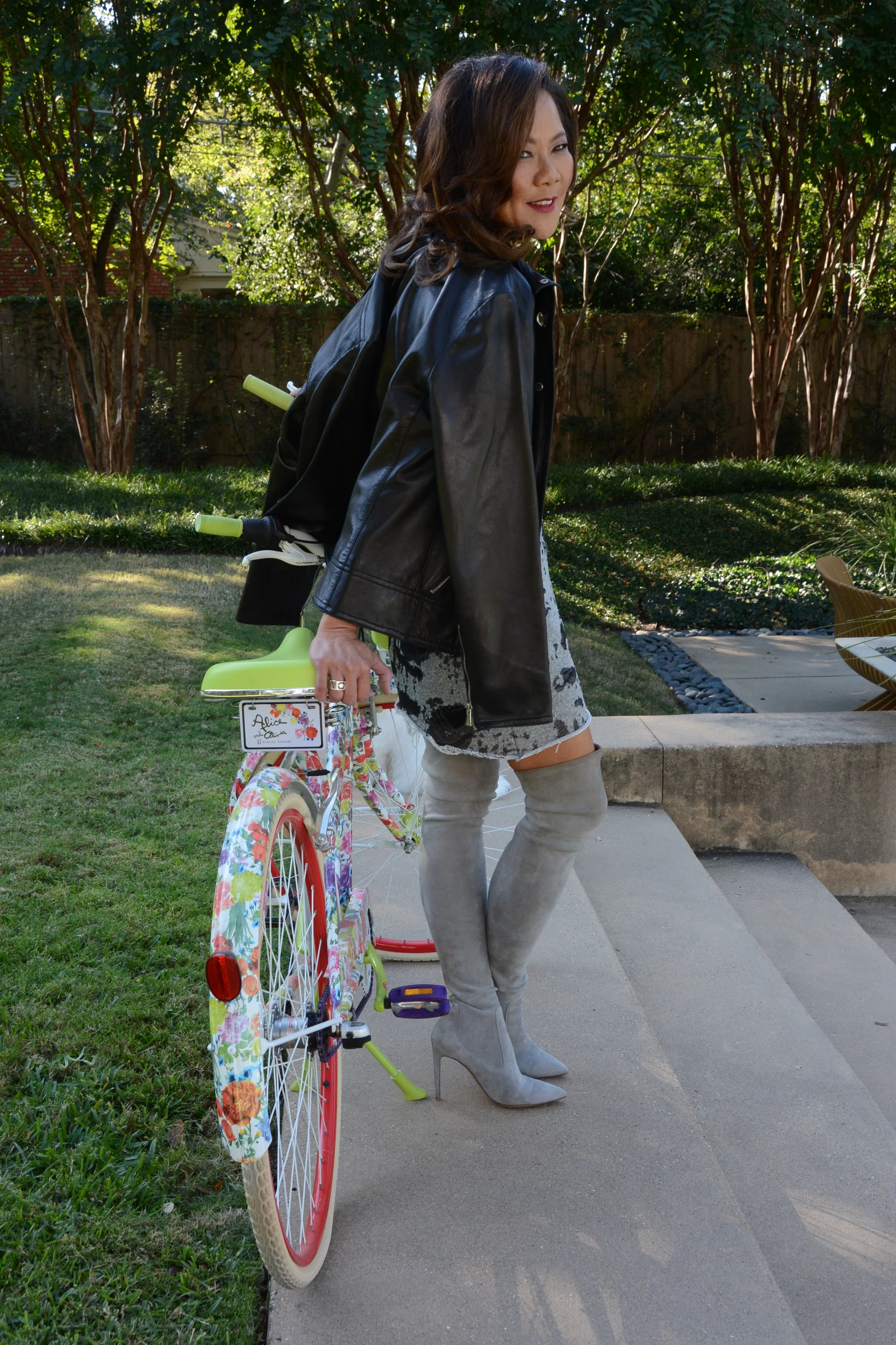 The Michael Kors black leather jacket is more than 10 years old but I still like to throw it over outfits! My dove grey boots from Ralph Lauren are at least 2 years old. I got them before the over-the-knee boot trend became big again and fell in love with the rich color, pointy toe and - of course- the length. To give the look a finishing touch, I added more leather on my wrist from Cinco De Uno.