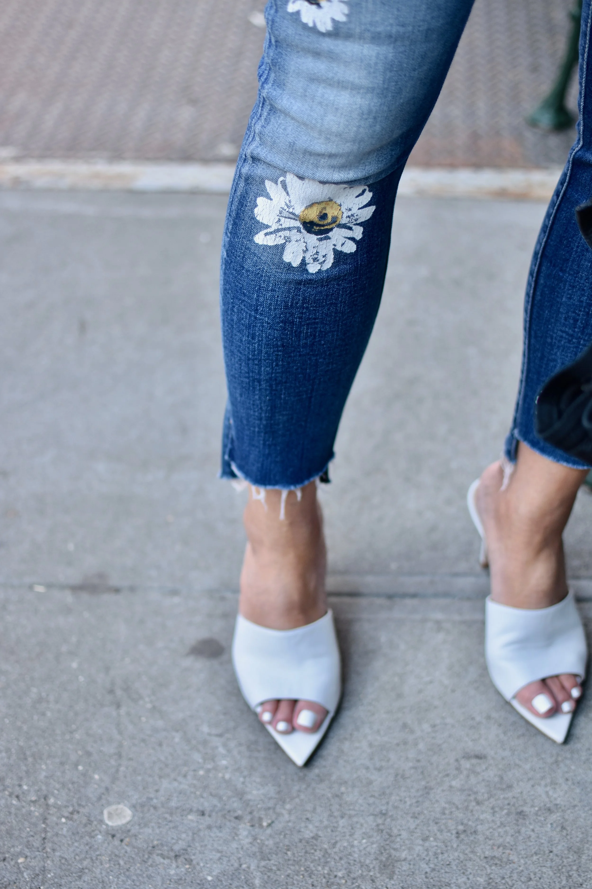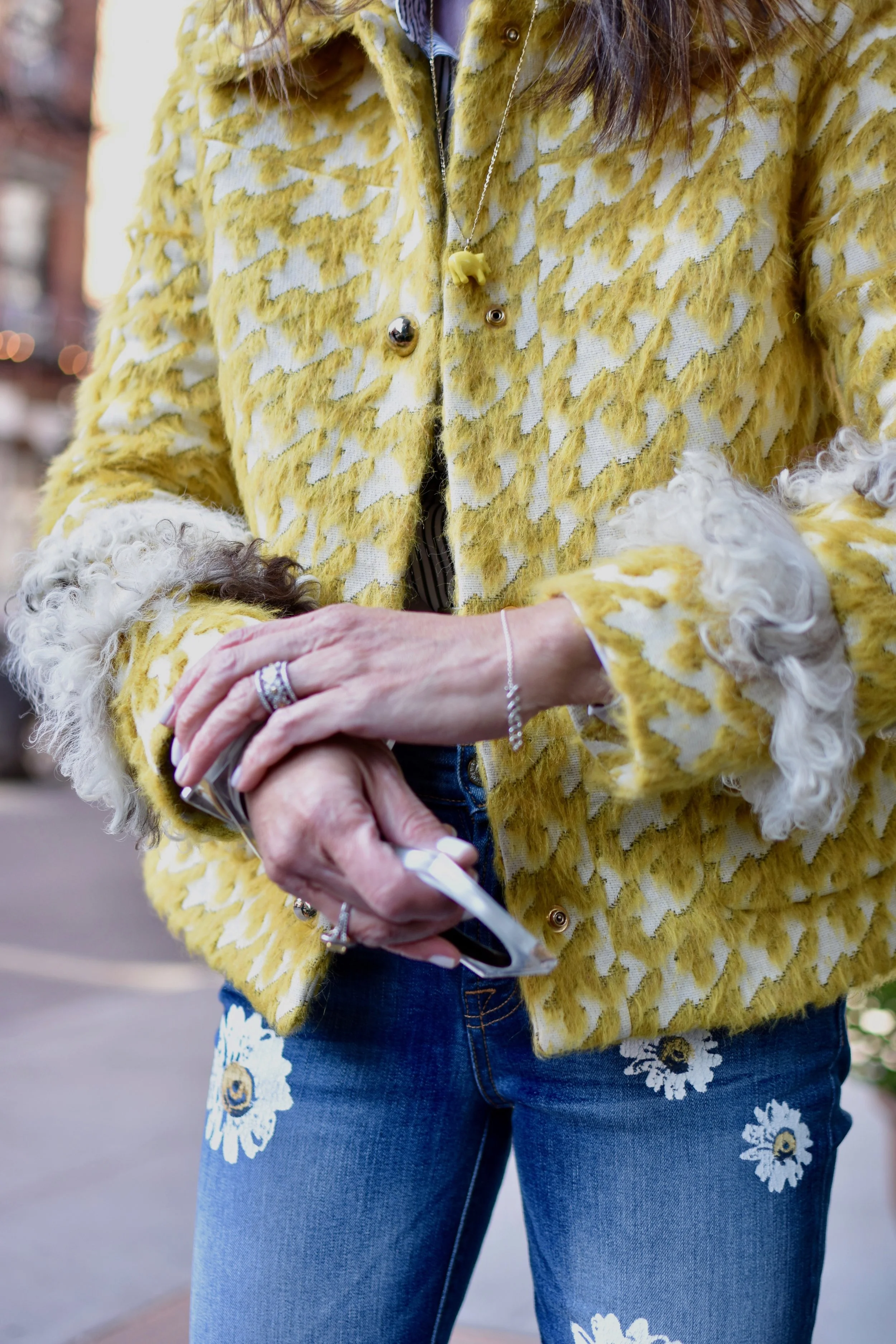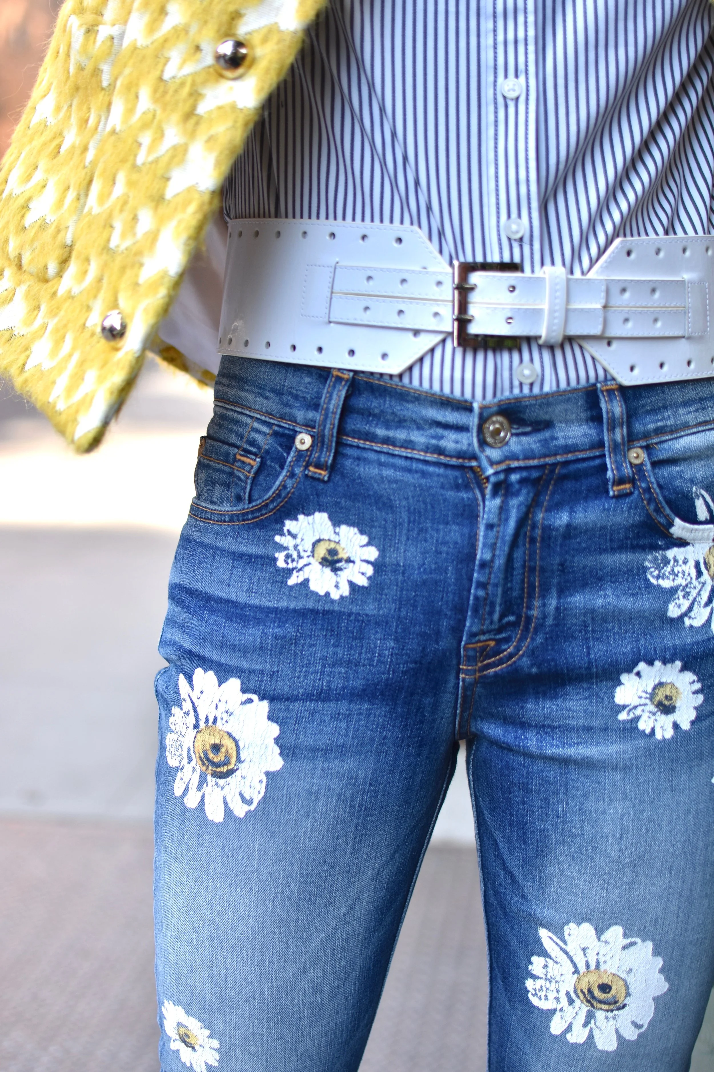 For this springtime look, I brought back my favorite Just Cavalli alpaca and mohair dyed yellow houndstooth jacket that I wore in my very first post!. However, this time I removed the detachable fur collar for a more streamlined look. Underneath, I am wearing a white with blue pinstripe cotton button-down blouse from Banana Republic and a pair of 7 for all mankindHigh-Rise Ankle Skinny Jeans w/ Daisy Floral-Print & Raw-Hem. To give this outfit a little bit of a sleek/retro vibe, I added this wide white leather belt that I found in a local boutique which has detailing on the edges and double buckles. I particularly like that it accentuates the curvature of the waistline and coordinates perfectly with my white mules by GIANVITO ROSSI.