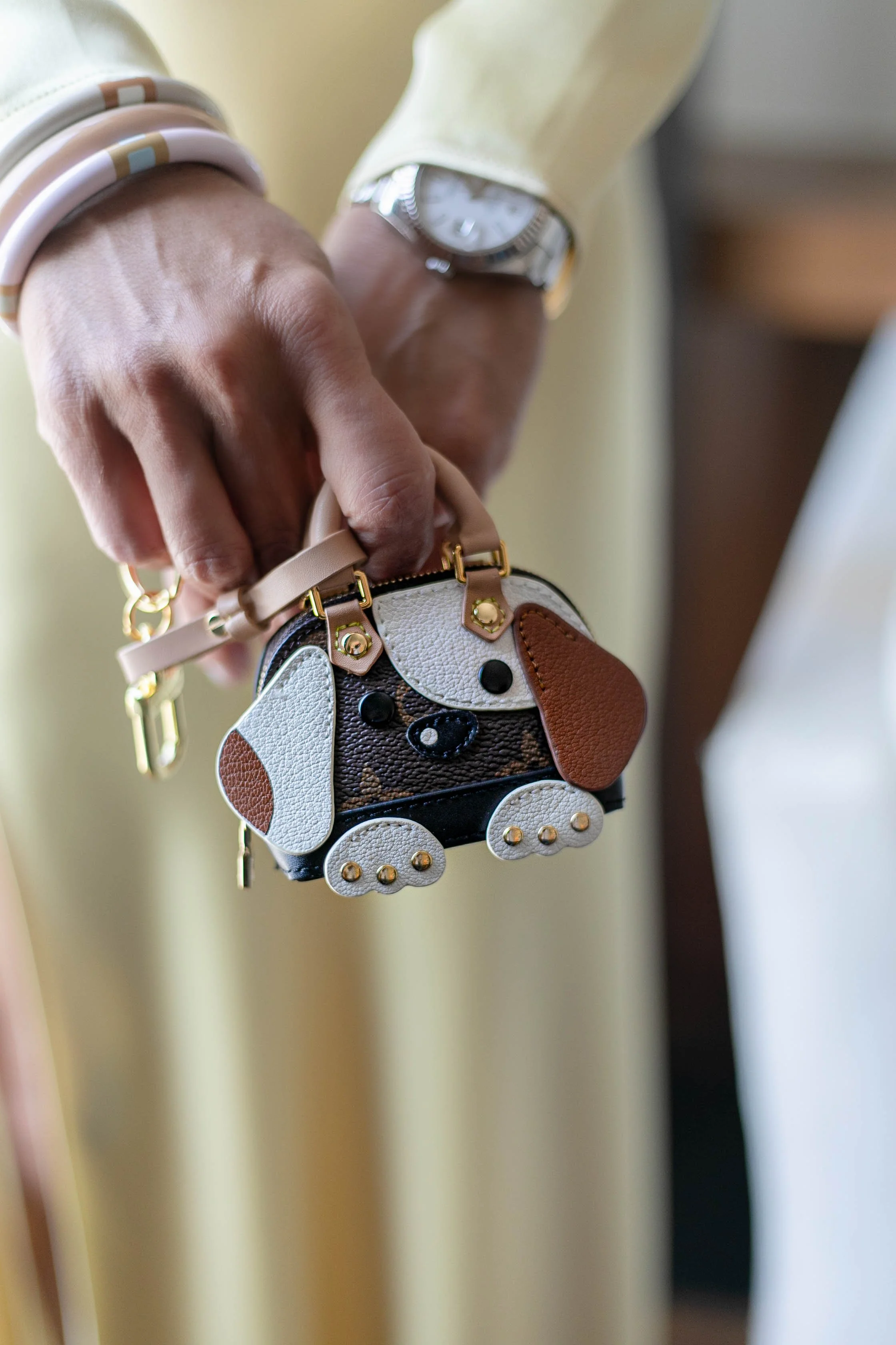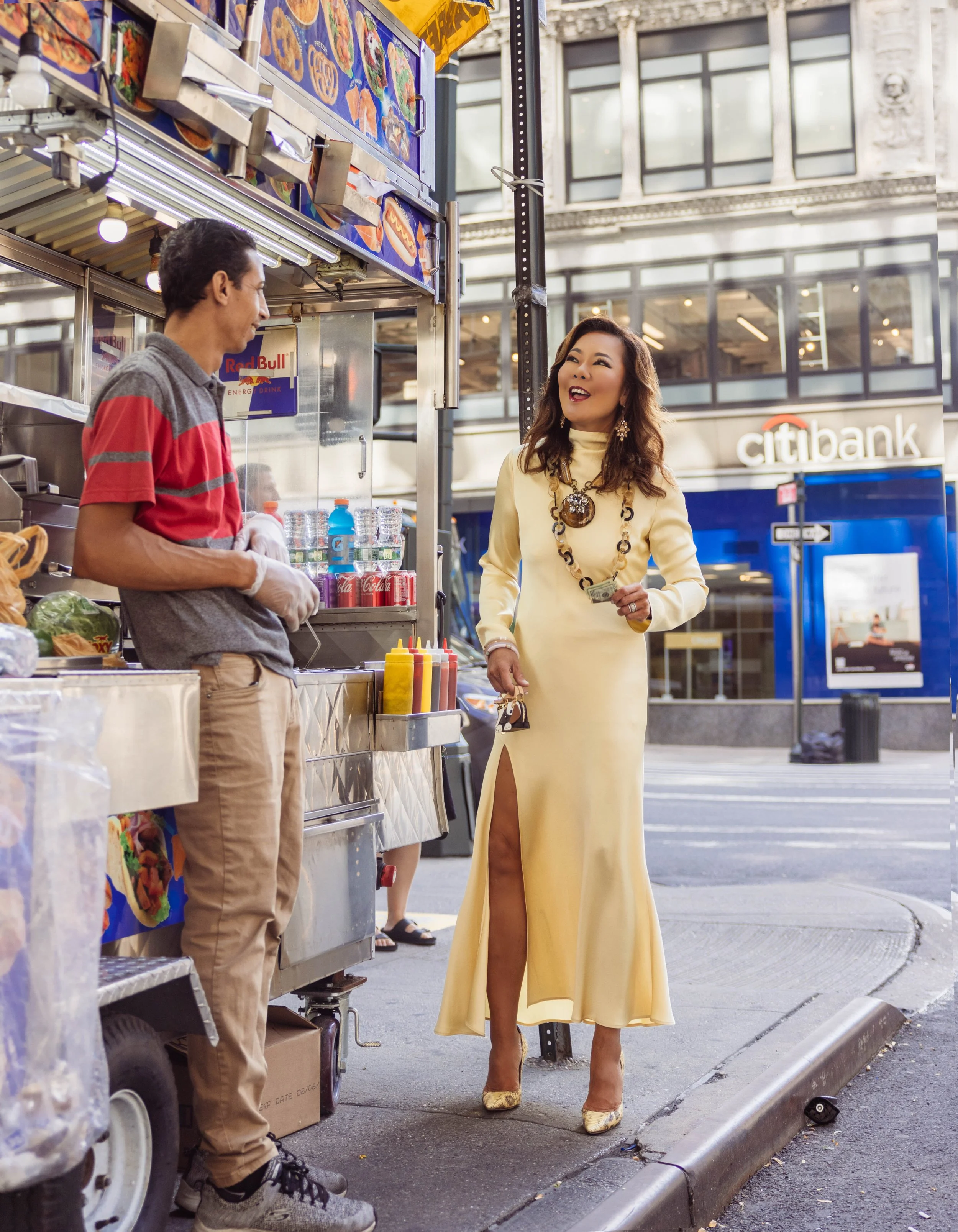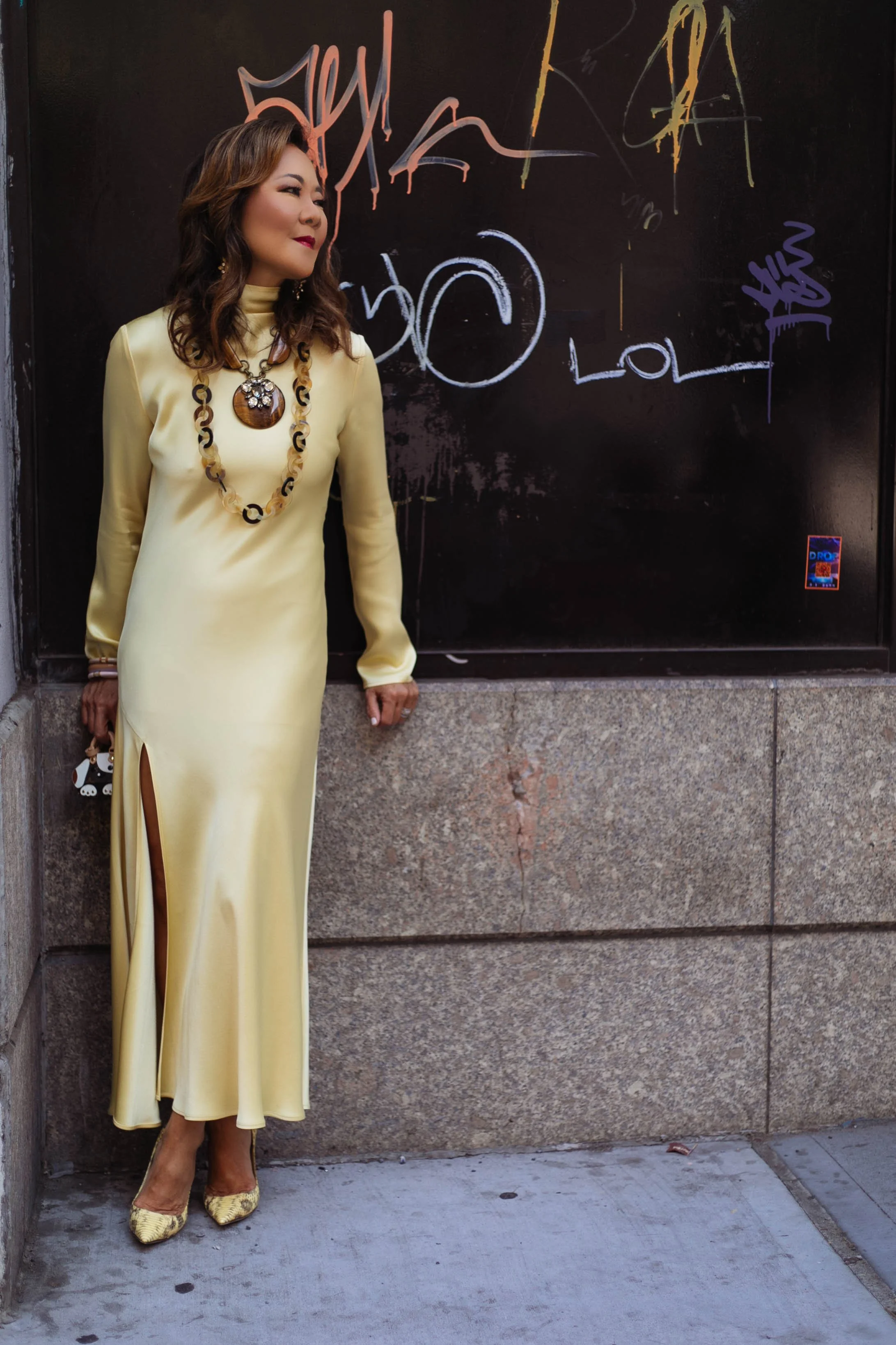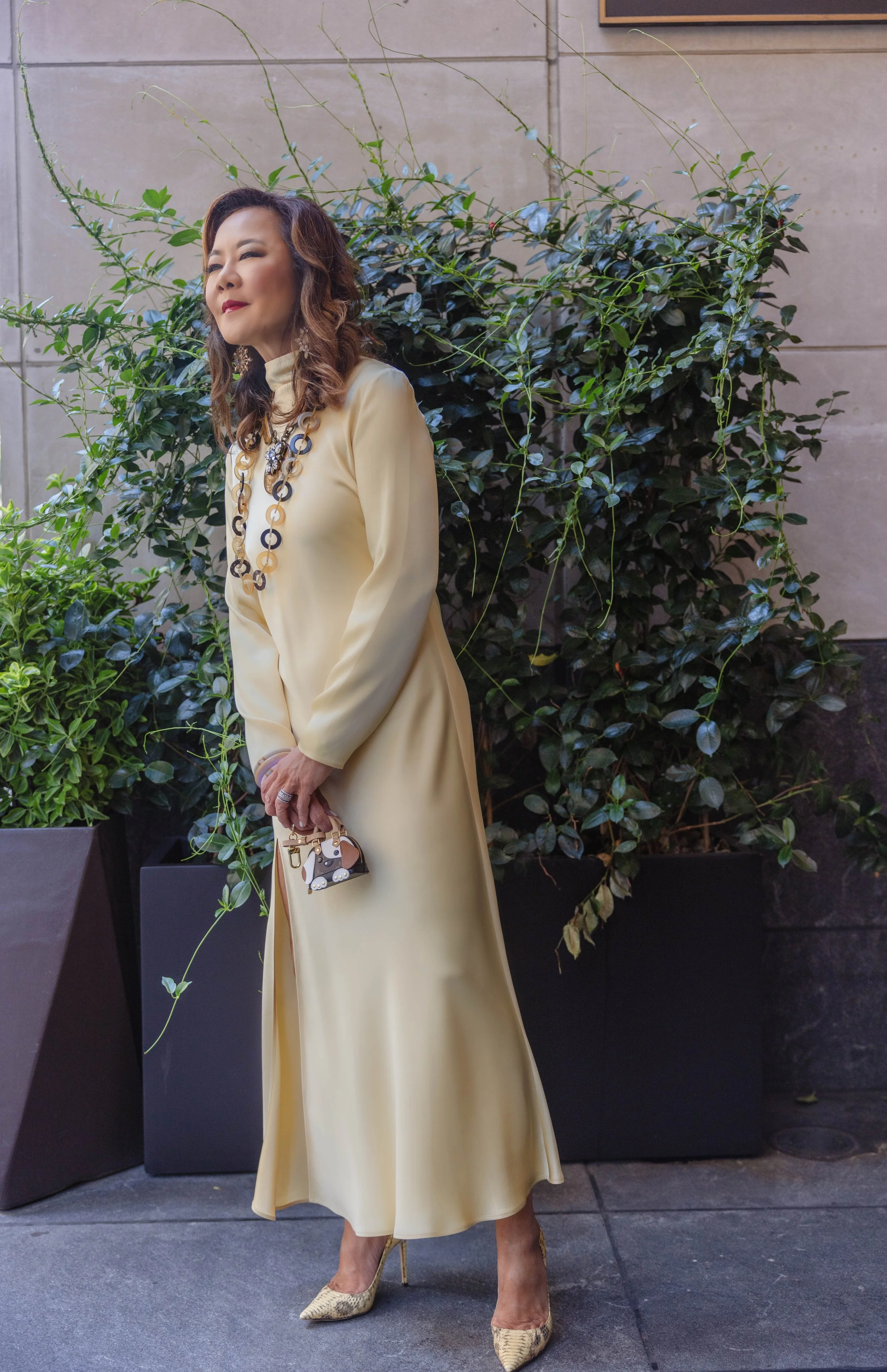 I came across these photos form earlier this year in my favorite Sally Lapointe draped satin midi dress (a similar one is available here). I feel visceral joy when I put this dress on, and I think it shows in these images! I paired simple tonal flea-market-find necklaces, my workhorse yellow snakeskin Manolo Blahnik pumps and the sweetest Louis Vuitton canine themed change purse!.