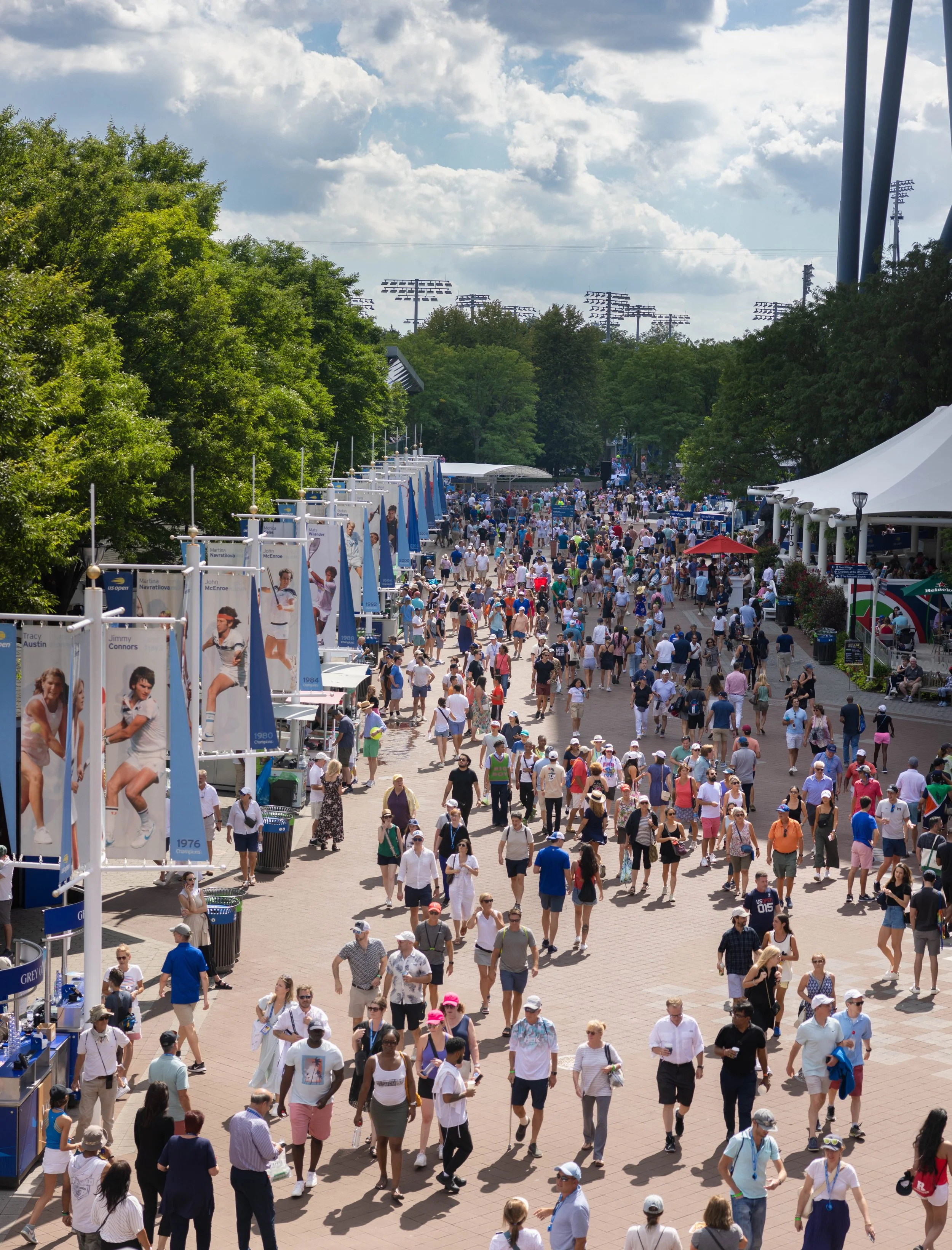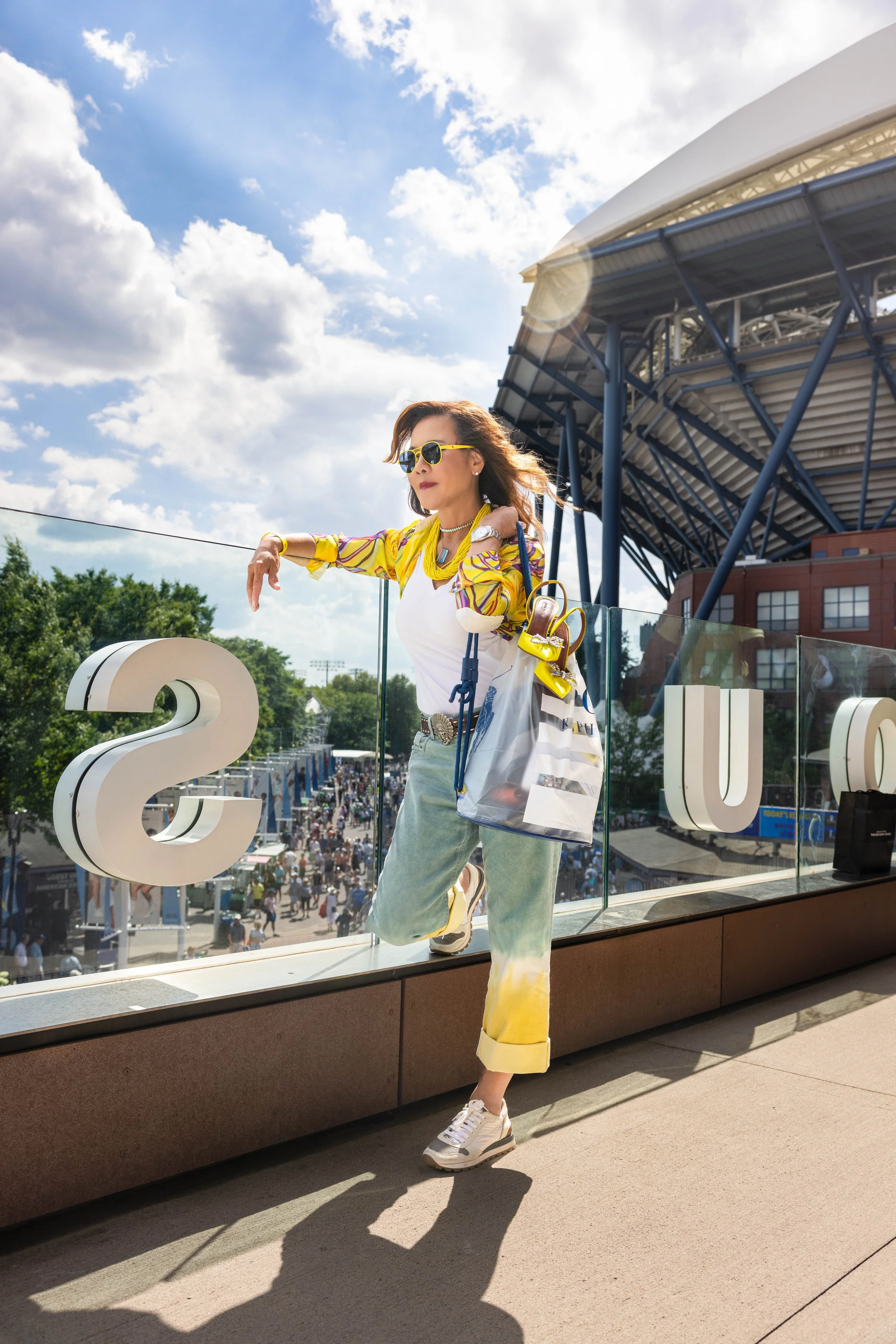 The US Open holds many wonderful memories for me in addition to being a highlight on my calendar each year. The energy and excitement in the air is nothing short of exhilarating. While spending my afternoon people, and tennis watching, I am wearing a yellow print Christian Dior blouse over a tried + true Gap white Modern V-Neck t-shirt, paired with ombre culotte jeans from Etro. I had two pairs of shoes with me. For exploring and walking around, I wore my white embellished suede sneakers from Brunello Cucinelli but changed into my yellow satin Amina Muaddi Rosie Crystal Bow Halter Pumps and also added an Akris Punto yellow leather short sleeve Nappa jacket to elevate the look while meeting friends for dinner. I believe the yellow is no longer available but a similar one in black vegan textured leather is still available here.