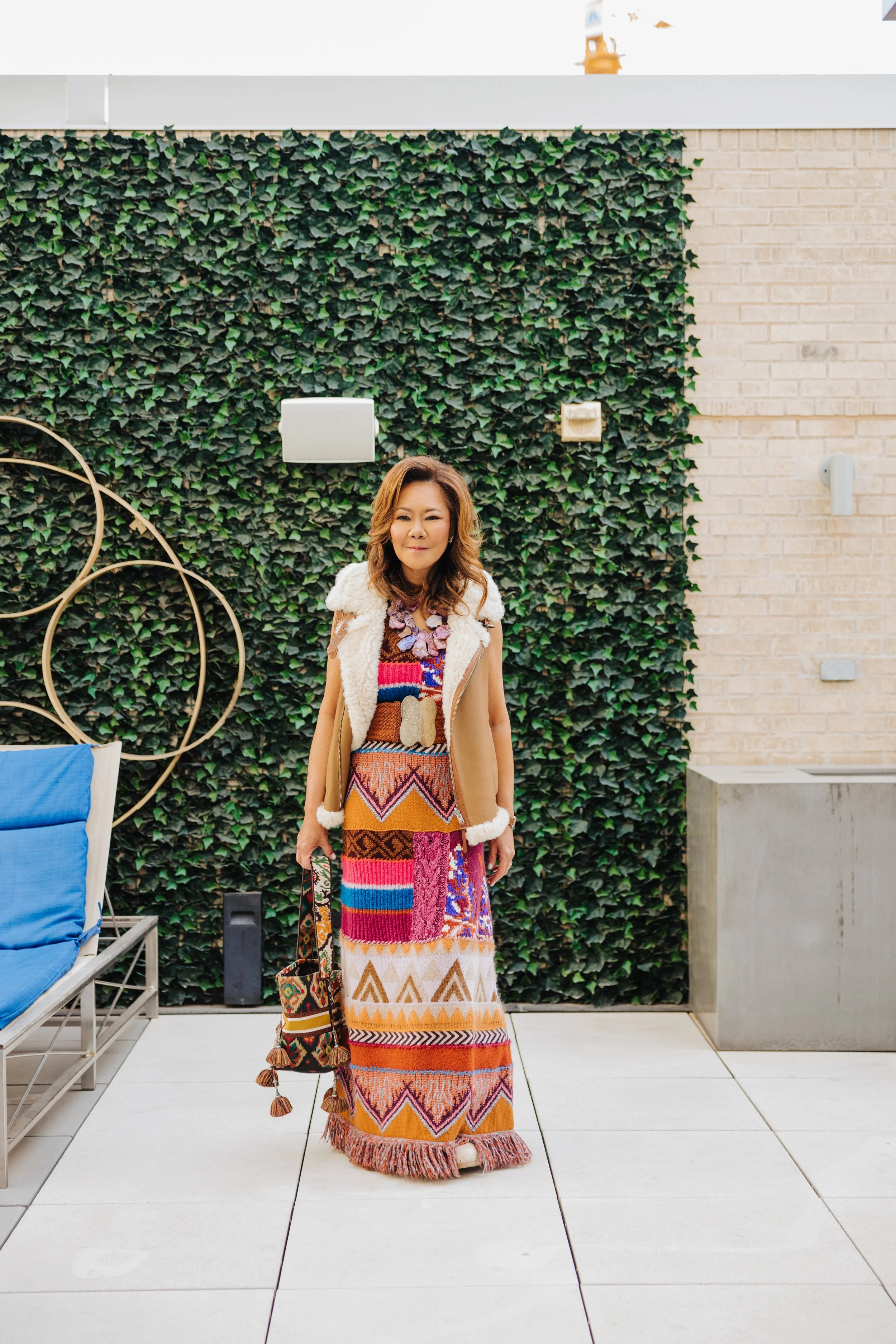 I paired this Coach leather vest with white shearling and leather buckle detailing very differently in this post I shared in March, 2019 . Today I am layering it on top of this gorgeous multicolored Etro patchwork knit maxi dress and Hermes bone Carlotta clogs. I added a wide brown leather woven Ralph Lauren belt with a large silver plate buckle to cinch my waist and offer a slightly more tailored silhouette to the dress. I’m also wearing a bold, chunky Nest purple Jasper statement necklace from their runway show. (This one is no longer available, but there are other options like this in black or this one for similar color). I think this necklace is a work of art and truly holds its own and compliments the colors in the detailing of the Etro dress!.