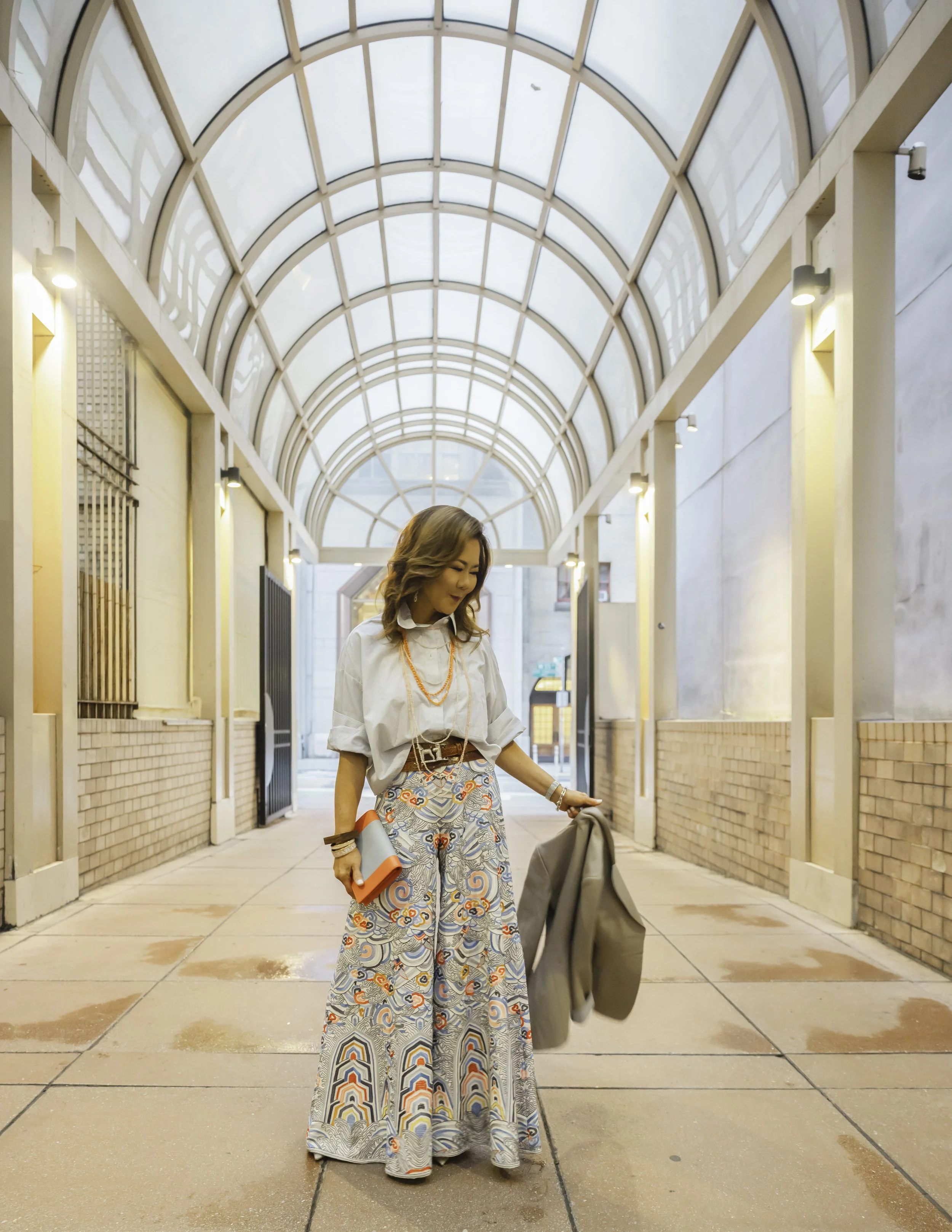 I am pairing a blue and white TWP button down blouse underneath a bone leather Ferragamo blazer with coordinating light blue lining and stitching and a Kieselstein-Cord thick leather belt. The Holli Glass Nude PVC Sling shoes from Amina Muaddi , coral Celine bag, and Hermes bracelets add final touches to a look that I can wear in many situations and events.