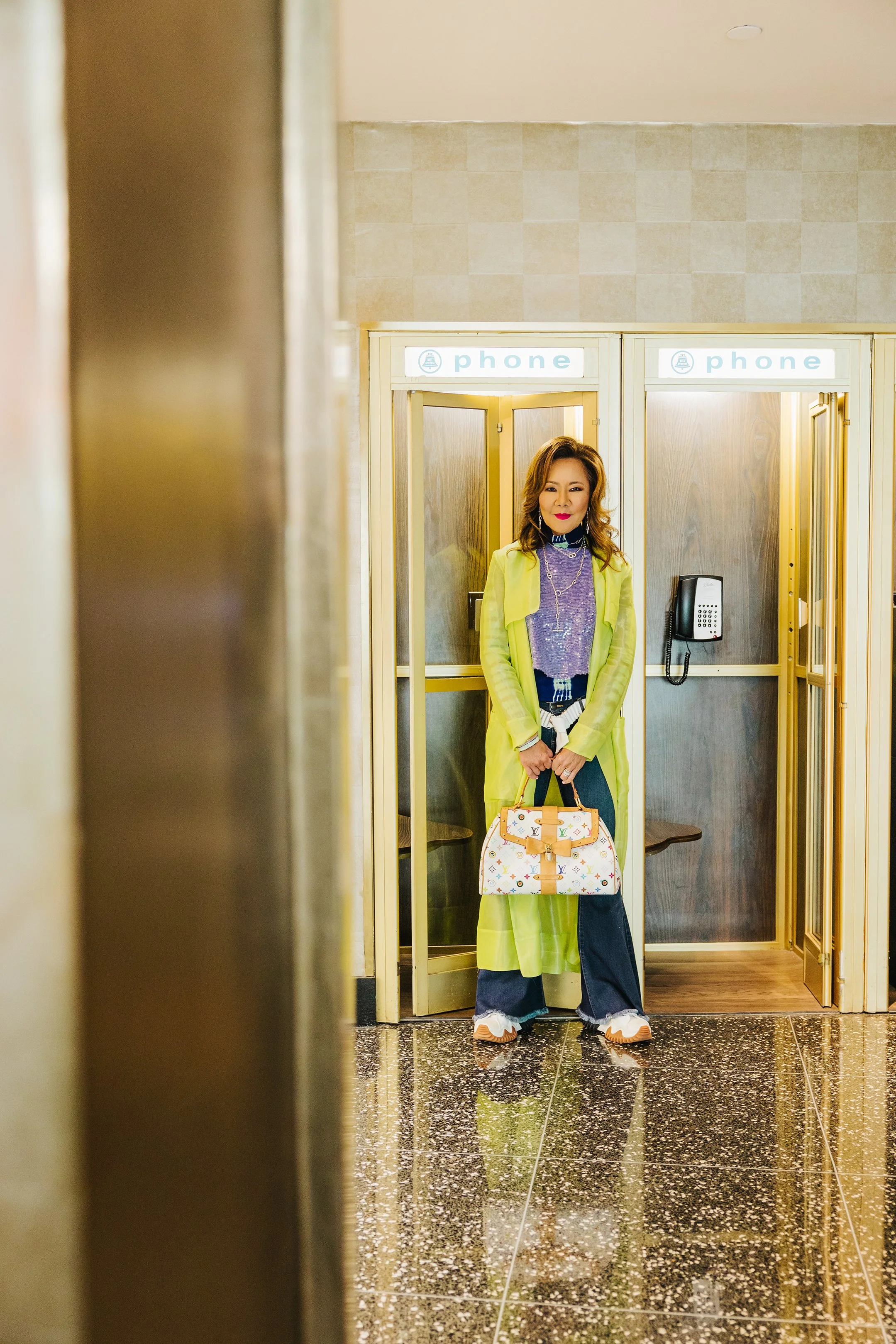 To complete the look, I am carrying a vintage Louis Vuitton multicolor monogram Eye Love You Sac, my everyday jewelry and an Hermes necklace.