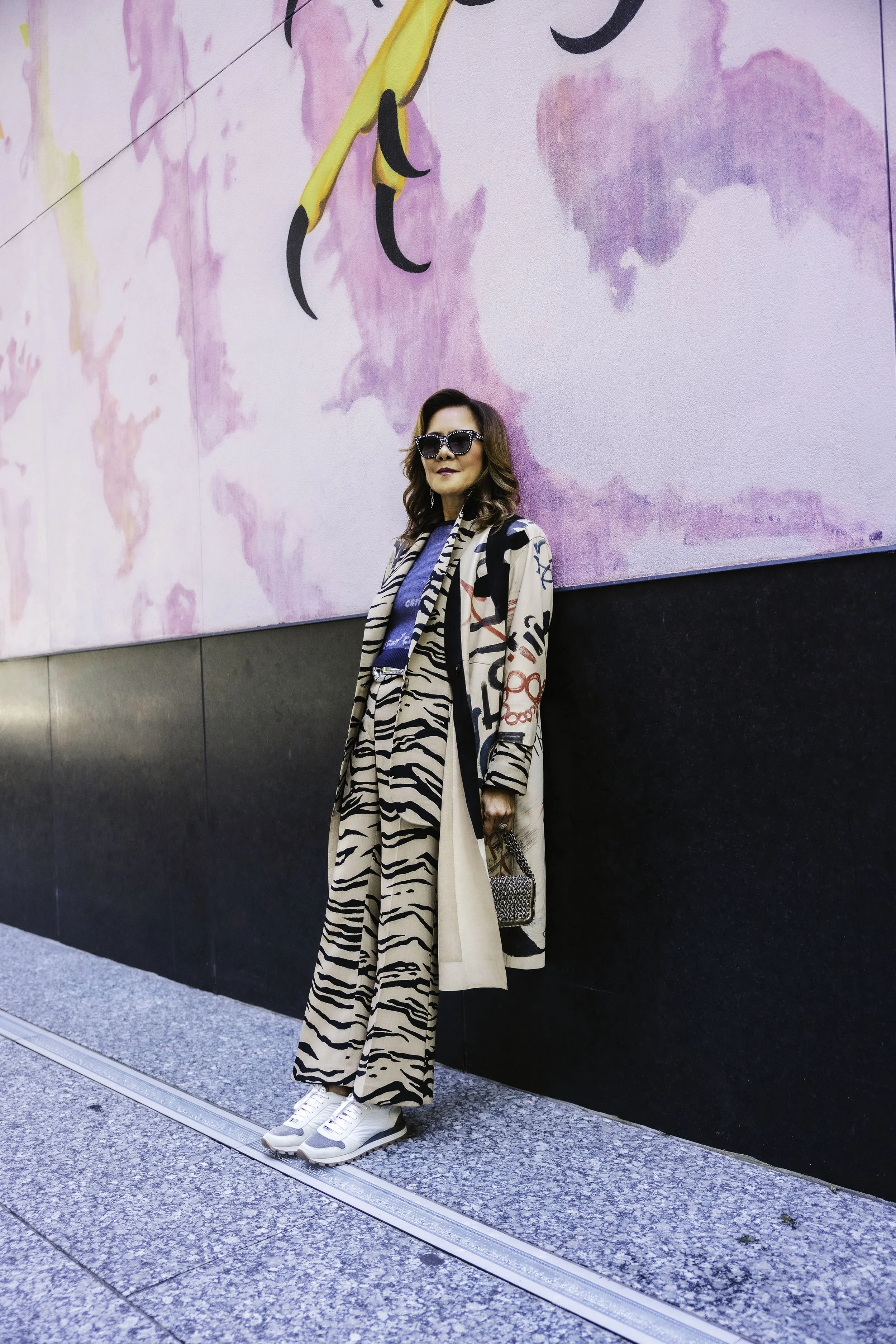 I am wearing a tiger pattern jacquard blazer and matching trousers , an IRO EMBELLA ROPE BELT and an adidas Originals Tubular Knit Graphic T-Shirt which was first featured here . The layered Donna Karan hand painted lambskin leather jacket is making its third appearance on W4 which goes to show just how much I love owning one-of- a-kind beautifully crafted pieces! You can see this styled differently here and on one of my very early blog posts!